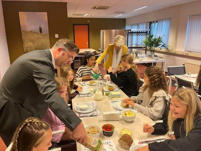 De burgemeester en wethouder schuiven aan tafel bij de 25 schoolkinderen van groep 8. Zij spraken samen over het belang van een gezond ontbijt. De burgemeester vroeg zich af of de kinderen iedere dag een ontbijt hebben en wat ze dan het liefste eten. Bijna alle kinderen eten dagelijks een gezond ontbijt. Burgemeester Lieke Sievers: ‘Als je iedere ochtend goed ontbijt, heb je genoeg energie voor de rest van de dag en het is heel goed voor je concentratie. En als je dan ook nog gezellig samen met je ouders ontbijt, dan heb je ook nog even de tijd om te praten met elkaar.’