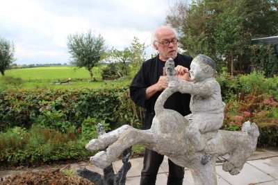Een plek bij het Schooltje mag dan wel de eindbestemming zijn, voorlopig staat het beeld in Warder waar beeldhouwer Diek Kubbe begonnen is aan de hoognodige restauratie. Een langdurige, vrijwillige klus in de buitenlucht.