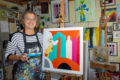 “Dat Volendamse wil ik altijd in mijn kunstwerken terug laten komen. Op dit moment ben ik bezig met een kunstwerk genaamd Achter het derde klaphek. Volendammer vrouwen gingen vroeger te werk in Amsterdam om te dienen bij gezinnen. Mijn moeder heeft dat ook gedaan, netjes in klederdracht met het pontje naar Amsterdam. Ze gingen te werk ‘buiten het derde klaphek’. Op het doek staat een Volendammer vrouw in klederdracht, met daarachter Amsterdammer geveltjes.” De kunst van Angelique is binnenkort te zien tijdens Kunstkijken in de PX. Wilt u nu alvast wat bekijken, dan kan dat op haar website: www.angeliquevandenhogen.nl