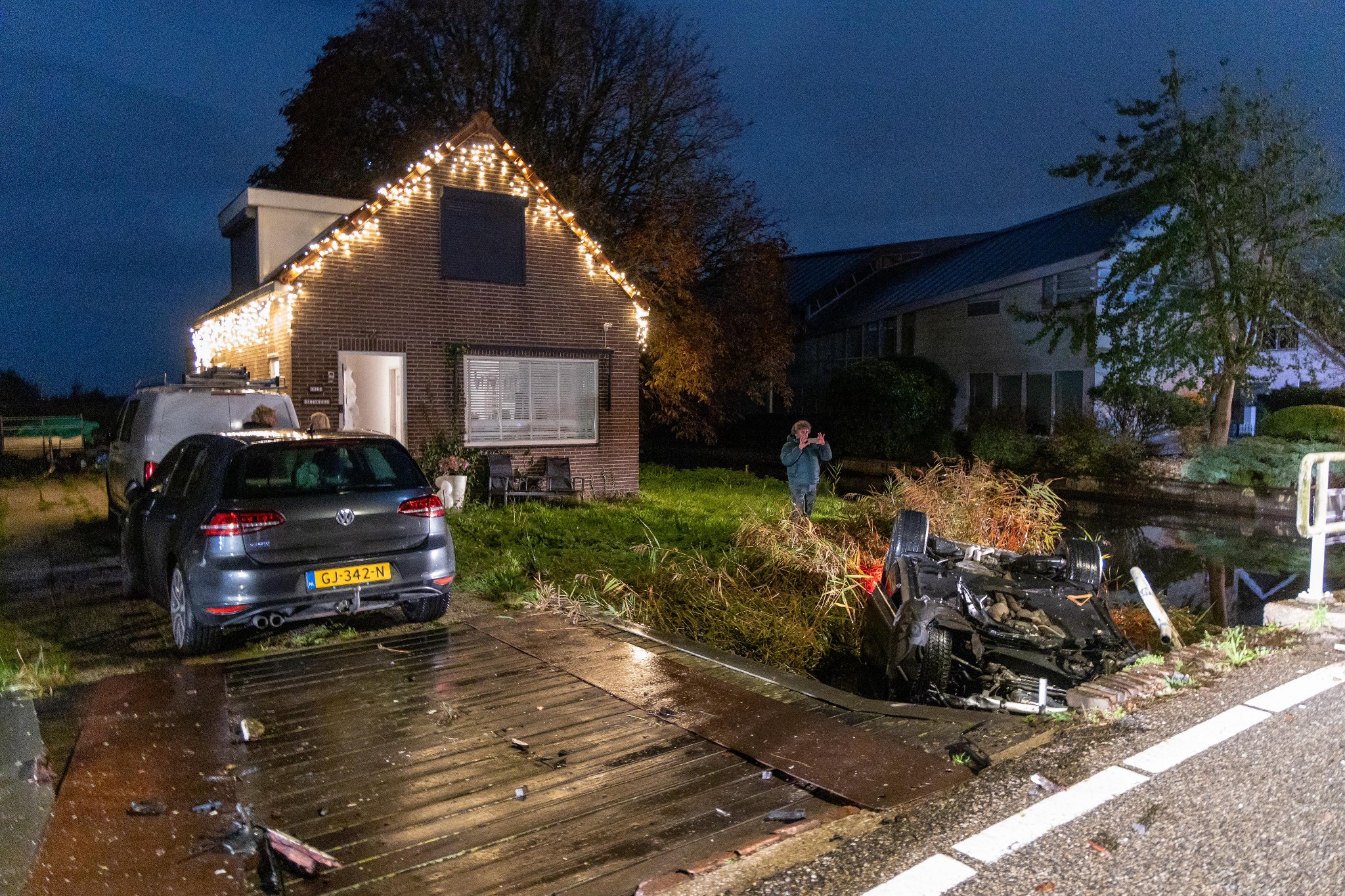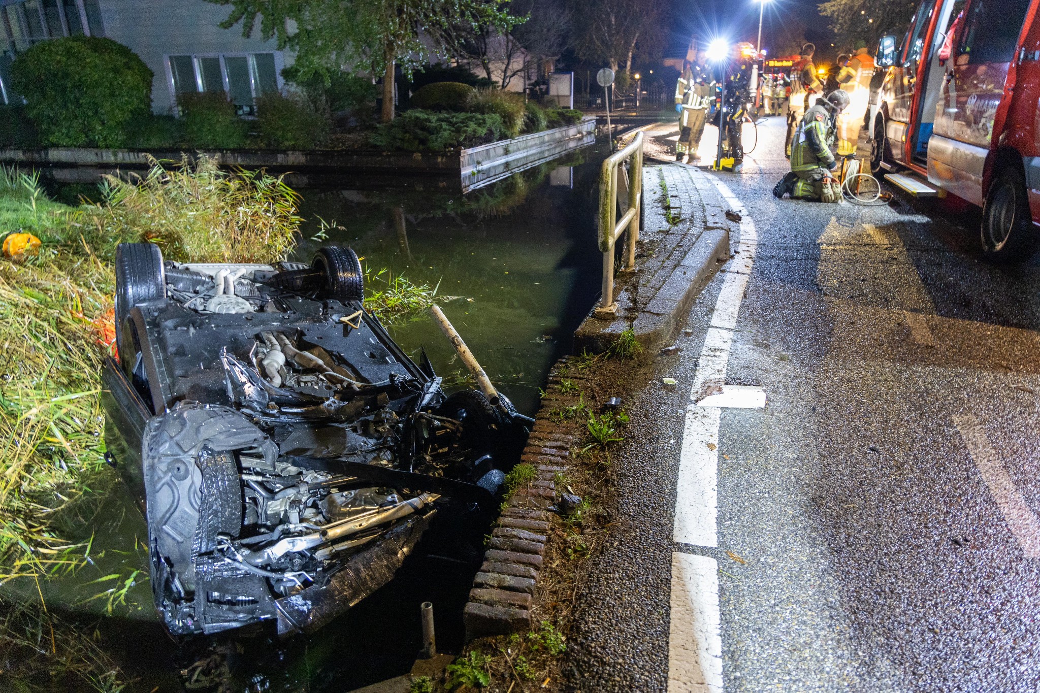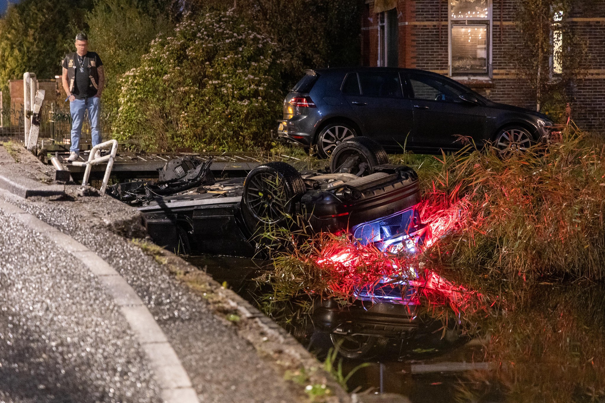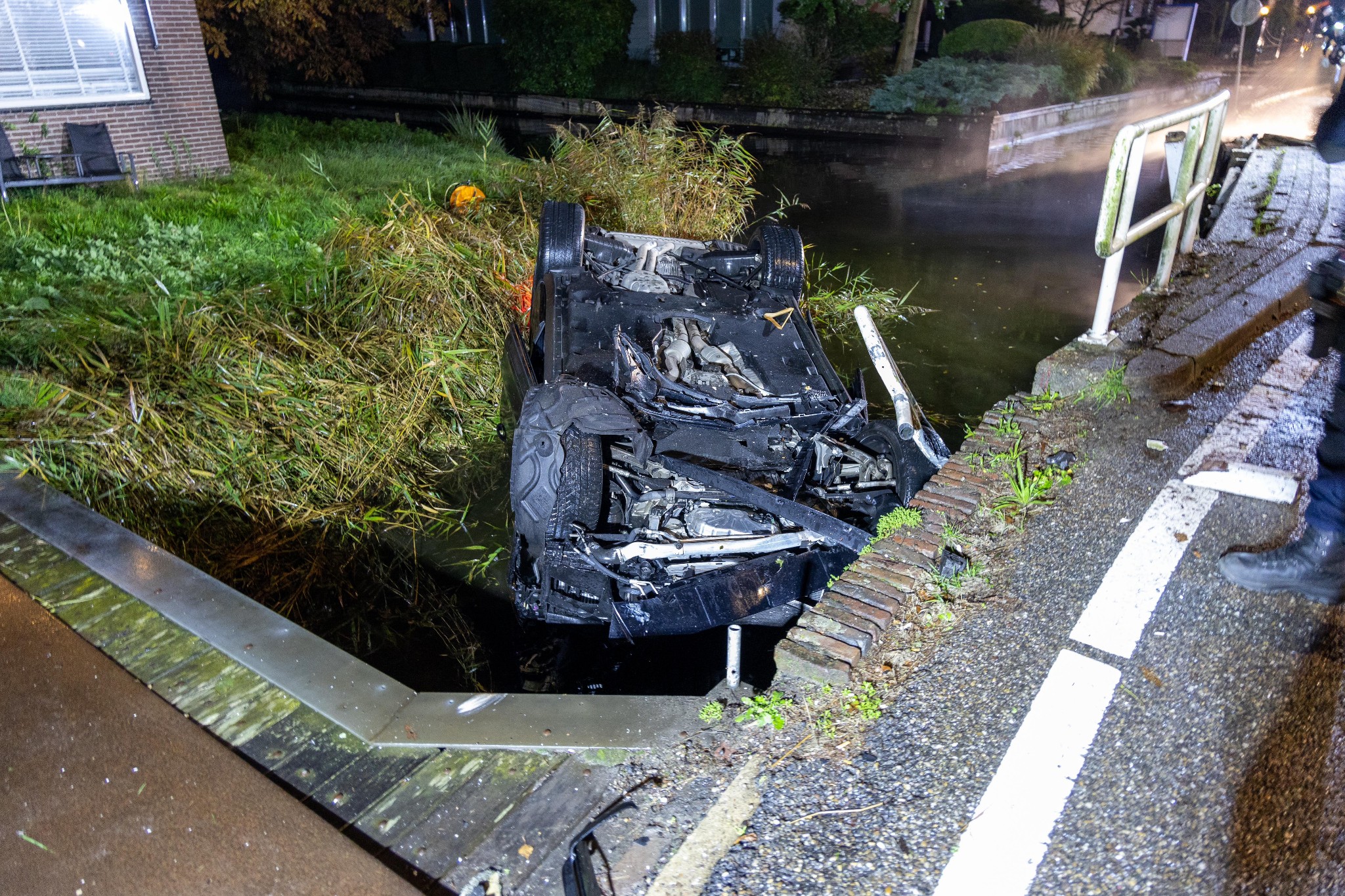 De automobilist raakte eerst een hek, een verkeersbord, de stenen van de sloot-rand en daarna kwam de auto ondersteboven in de sloot terecht. Hulpdiensten werden massaal opgeroepen, toen de auto werd aangetroffen. Echter bleek de bestuurder gevlogen. Hij/zij was niet meer aanwezig.