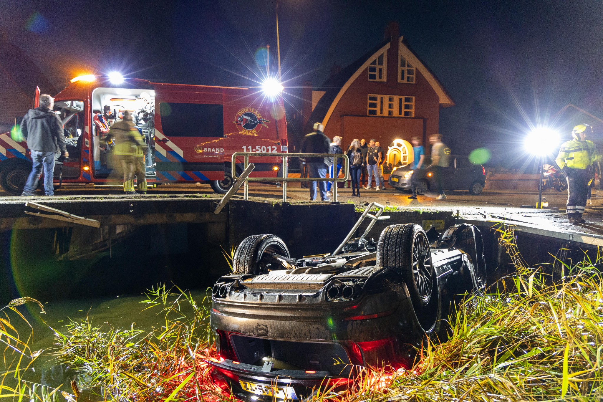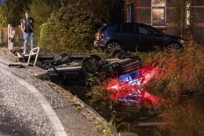 In de nacht van vrijdag op zaterdag rond één uur is langs het Noordeinde in Landsmeer een auto gecrasht. Een Porsche 9YA belandde in de nauwe sloot.