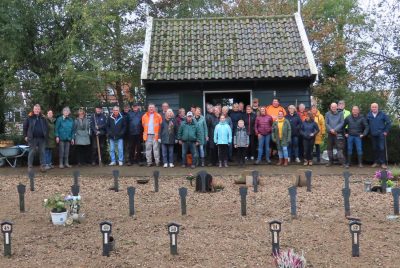Op initiatief van de Stichting Eilandraad Marken en Bernice Perk Uitvaartbegeleiding hebben vrijwilligers, van jong tot oud, afgelopen zaterdag de algemene begraafplaats aan de Buurterstraat op Marken een ‘clean-up’ gegeven. Met ruim vijftig vrijwilligers mag de actie een groot succes worden genoemd. Na vier uur hard werken heeft er een ware metamorfose plaatsgevonden op de Marker begraafplaats en is het weer een respectvolle herdenkingsplaats geworden. Foto: Alle vrijwilligers voor het Knekelhuisje (het waterhout van het Knekelhuisje wordt nog gereinigd)
