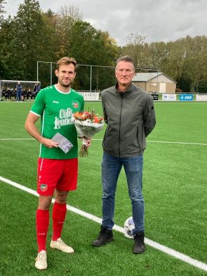 Voor aanvang van de wedstrijd EVC-Monnickendam werd Niek van Diepen vandaag door bestuurslid Erwin Rossenaar gehuldigd met bloemen en een bon. De uitwedstrijd bij Jong Holland van 30 september jl. was voor Niek namelijk een jubileumwedstrijd, zijn 200e in EVC 1.