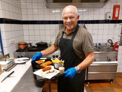 “Ik ga ten onder aan mijn eigen succes”, merkt hij bescheiden op. “Eens per twee weken maak ik een maaltijd naast het standaardmenu. Zo is er een pastamenu, een Indische rijsttafel, hutspot, soto ajam en Binky’s stoofpotje. Dus er komt iedere keer wat anders op tafel. Alles kan, ophalen of gezellig met elkaar in de kantine eten. De club koopt in, ik kook en met een team van vrijwilligers verzorgen we dan de maaltijden. De prijs willen we onder € 10,- houden waardoor het voor velen bereikbaar is. Op vrijdag 27 oktober staat Soto Ajam, Indische maaltijd kippensoep, op het menu.