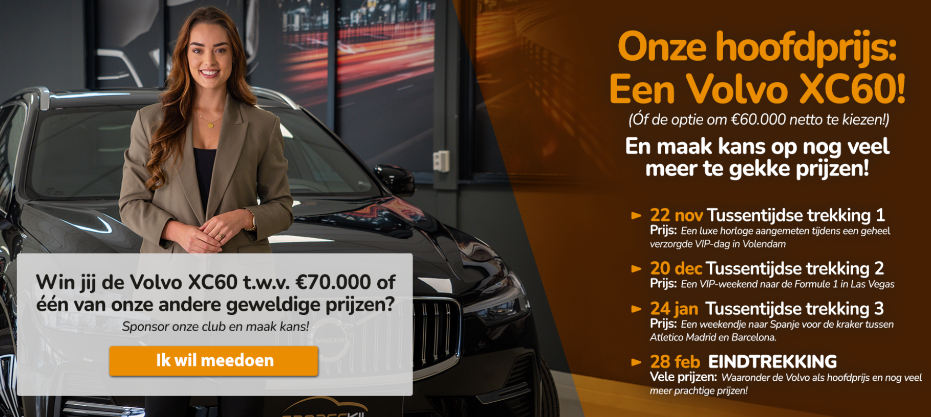 Wil jij kans maken op het winnen van deze Volvo XC60? Word nu voor slechts €9,63 eenmalig sponsor van onze club en waag je kans! Door een sponsorpakket af te nemen maak je ook kans op andere gigantische prijzen, zoals een Formule 1 reis naar Las Vegas, een week zomervakantie in Holunderhof en veel meer!