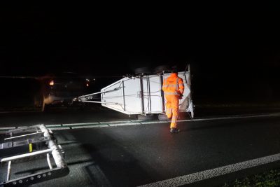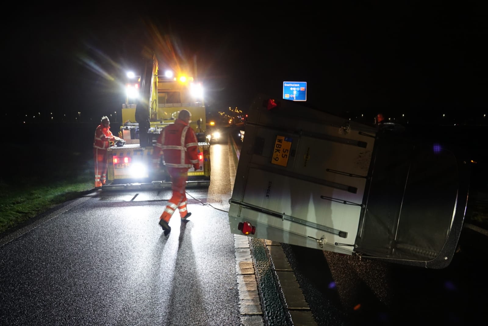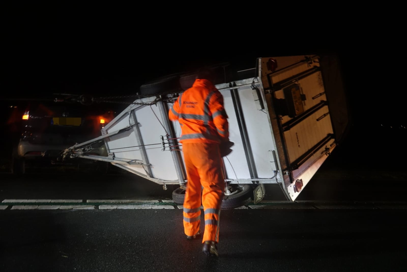 De paardentrailer zat achter een auto en die was omgewaaid. Gelukkig stond er geen paard in de aanhanger. De N244 was hierdoor een uur lang dicht. Niemand raakte gewond.