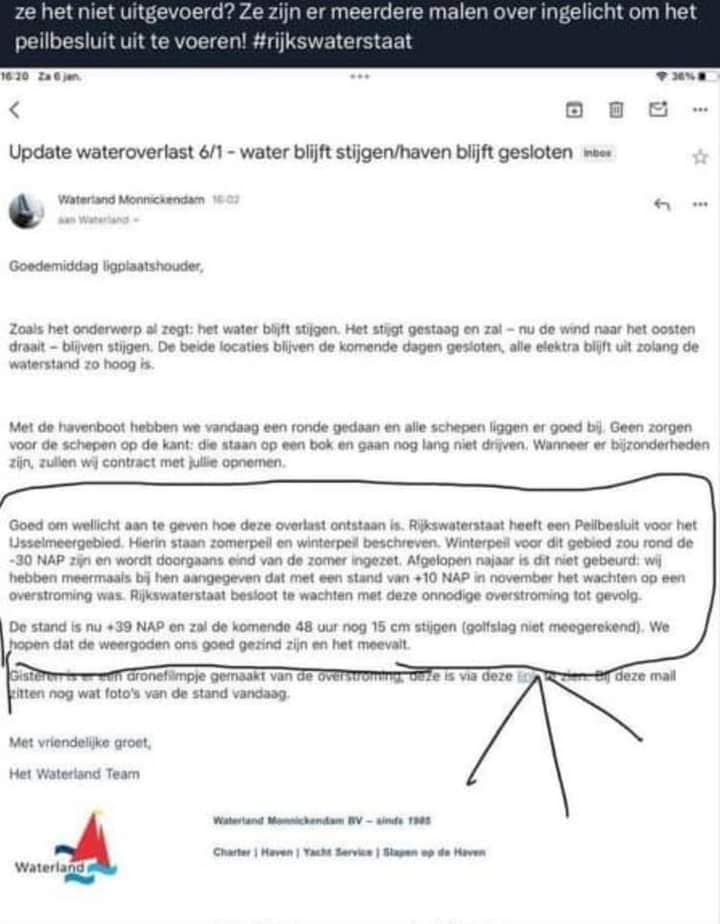 Wat dat betreft zet onderstaande brief een en ander toch in een ander daglicht. Geen wereldwijde complotten of opwarming van de aarde, maar simpelweg Rijkswaterstaat die ‘weigerde’ het waterpeil te verlagen zoals gebruikelijk – en dus ook noodzakelijk – is gedurende de wintermaanden.