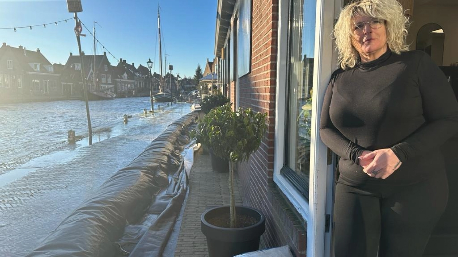 Het waterpeil in het Markermeer is sinds gisteravond aan het dalen. Vanmorgen was de stand volgens Rijkswaterstaat nog historisch hoog, maar al gezakt naar 31 centimeter boven NAP. Monique Mol van de kapperszaak in Monnickendam zit eerste rang bij het hoge water. “Het komt gelukkig niet door de zandzakken heen, maar het water komt wel over de kade.” En die is nu spek en spekglad.