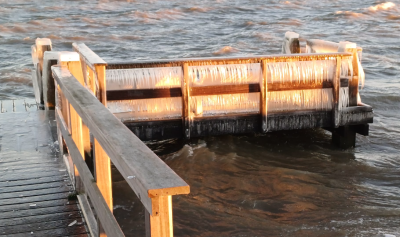 Spekgladde ijsvlaktes markeren dinsdag de plekken waar het Markermeerwater de voorbije dagen het land teisterde in Volendam en Monnickendam. Het ergste leed lijkt geleden, maar er is ook het besef dat je de grillen van de natuur niet in de hand hebt. Bij hotel Spaander herinneren een spiegelglad parkeerterrein en vlonders vol ijspegels eraan dat het water de afgelopen dagen op plaatsen is geweest waar het normaliter niet komt.