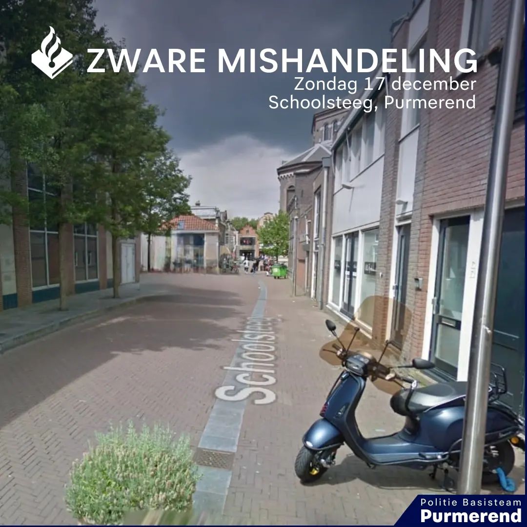 Zondag 17 december 2023 omstreeks 00:30 uur vond een zware mishandeling plaats op de Schoolsteeg in Purmerend. Hierbij zijn twee personen mishandeld door meerdere personen. De politie doet onderzoek en zoekt getuigen.