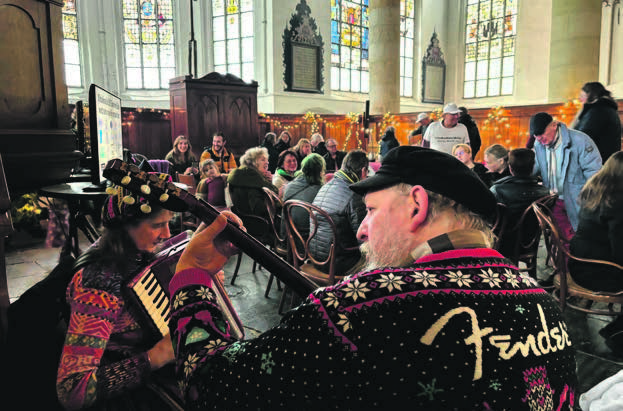 In het ‘oliebollencafé’ zijn zitjes voor een warme oliebol met koffie of glühwein. Het Engels-Edamse duo John en Jaye zorgen weer voor mooie livemuziek. “Hier mijn oliebollen halen hoort voor mij bij Oudejaarsdag. De sfeer zorgt voor dat speciale overgangsgevoel van het oude naar het nieuwe jaar. En hier in de kerk eet ik altijd mijn eerste oliebol”, zegt een bezoekster en neemt dan met een vrolijk gezicht een flinke hap.