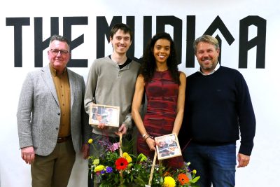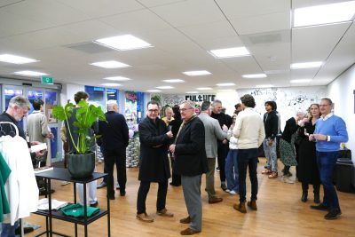 Vrijdag 12 januari is het gezellig druk in de Kalversteeg bij de voormalige ABN bank. Niet met klanten die geld komen halen, de bank is er al een poosje niet meer, maar vanwege de opening van een ‘creatieve hub’ The Mudita. Een plek waar kunst en ondernemerschap samensmelten. Wethouders Mario Hegger en Pascal Verkroost nemen de opening voor hun rekening en wensen de oprichters Antóni Schulte en Alyssa Traoré veel succes met de nieuwe onderneming. Foto’s: Piet Jonker – www.weidevenner.nl.