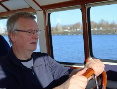 Vandaag gingen we op stap met als gast André en zijn collega’s Eric, Janine en Arjo. De vrijwilligers waren Yoni de schipper,. Marjon als boots/gastvrouw en ik (Lucia) als stagiaire/gastvrouw.Alle ingrediënten waren aanwezig voor een mooie vaardag. Zon, fris windje, beetje ijs op het dek, mooi licht om te fotograferen, dit werd dan ook volop gedaan en goed gezelschap.Dat bleek ook wel, want er werd veel gelachen, er werden anekdotes verteld en herinneringen opgehaald. Dat begon al bij binnenkomst met de opmerking: “of alle passagiers altijd wel terugkwamen…” waarop het antwoord was: “Tot heden toe nog wel.”