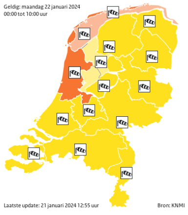 Vanwege storm Isha worden in Noord-Holland en het Waddengebied komende nacht en vroege ochtend zeer zware windstoten verwacht van 100-110 km/uur. Hiervoor geldt code oranje. Vanaf halverwege maandagochtend neemt de wind snel af en verdwijnen de (zeer) zware windstoten. Hierdoor kan schade en gevaar ontstaan als gevolg van omvallende bomen en rondvliegende voorwerpen
