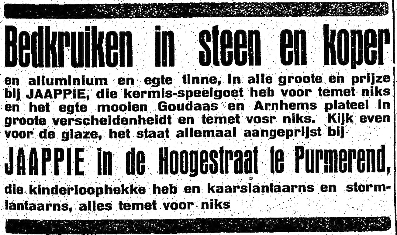 ‘Van de politierechter te Haarlem. De 36 jarige Meretje H.Z. te Purmerend stond voor de rechtbank vanwege smaad. In Purmerend wordt van gemeentewege aan arme kinderen op school melk verstrekt en zoowel Maretje, als de door haar beledigde M.B. hebben een gedeelde leverantie. Maretje had van de schoolkinderen hooren vertellen. Dat, wat B. leverde, half water half melk was. Daarover heeft ze op den avond van 17 januari wat staan praten met buurvrouwen, en ook B.’s jongere broer, die daar juist voorbij kwam onder ’t melkventen in betrokken. Omdat uit de vraag van Maretje aan den jongen B. ,,Heb je al gehoord van het praatje, dat er gaat van je broer, dat ie aan de schoolkinderen half water half melk geeft?“ en evenmin uit het gesprek met andere vrouwen smaad bewezen kan worden, concludeert de Officier tot vrijspraak, in welken zin de Rechter ook vonnis wijst, met de opmerking, dat beklaagdes houding tegenover haar concurrent toch in elk geval heel lelijk is geweest.’ Later sloten de twee kemphanen vrede en benoemde de hele zaak ‘een storm in een glas water/melk. Gelukkig had Jaappie Eikenboom op dat moment stormlantaarns in de aanbieding