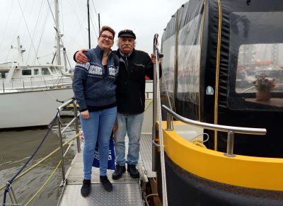 Na de Wilhelminasluis duiken we – nog steeds onder een strakblauwe lucht met onwerkelijke wintertemperaturen – de Zaan op. Historisch erfgoed, mooie groene huisjes en prachtige molens schuiven voorbij en vertroetelen het netvlies van Henk en Petra. Als we bij de molen ‘Het Jonge Schaap’ gaan aanmeren, staat Henk al in het gangboord om te assisteren. Hij heeft vandaag de ‘vaarwensboost’ en energie voor tien.