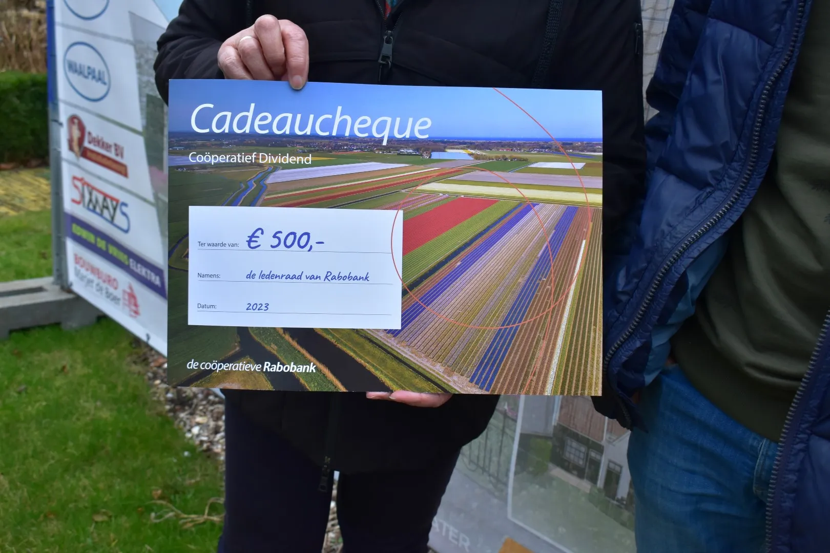 Aafje de Jong en Janna Bakker waren blij verrast met deze gift van € 500,- van de Coöperatieve Rabobank.