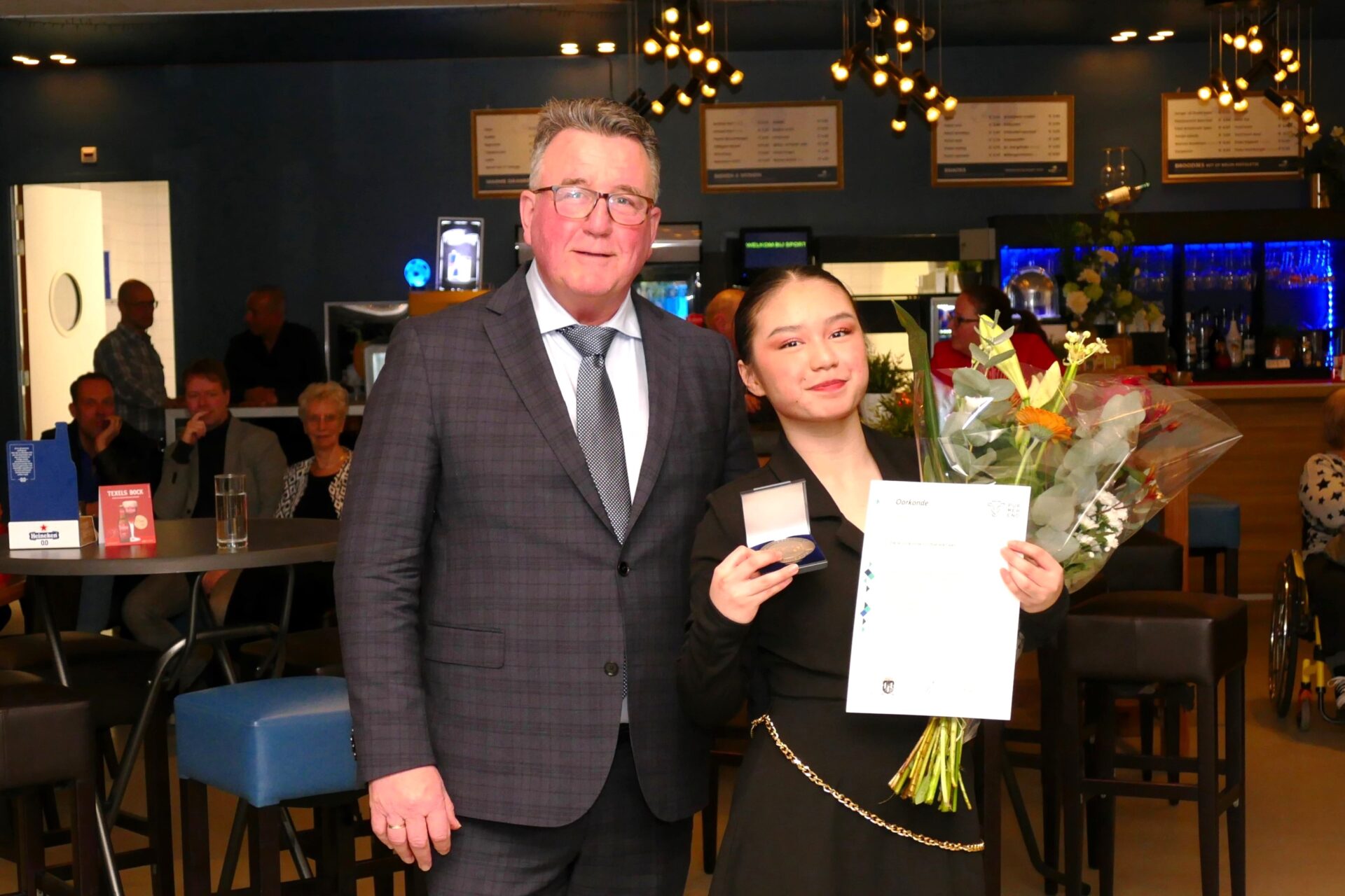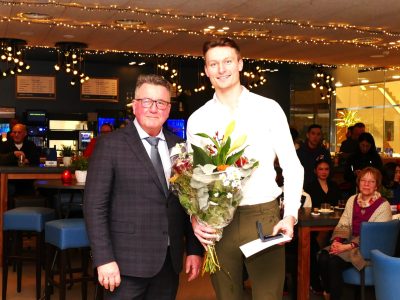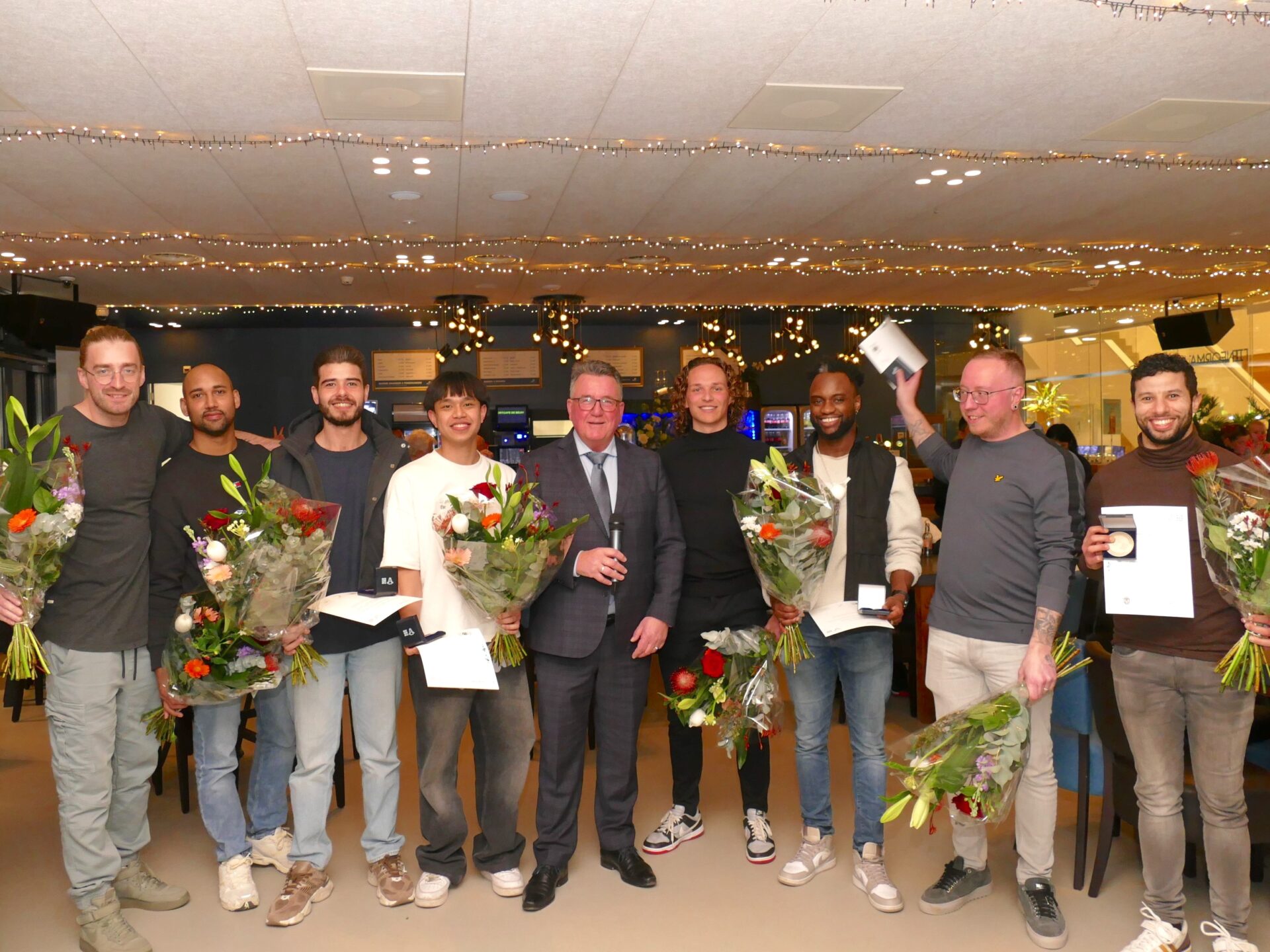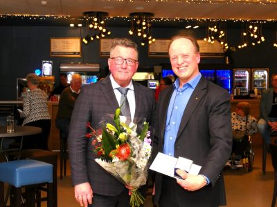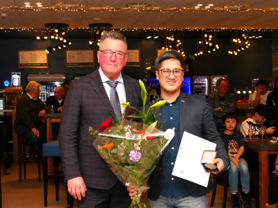 Wethouder Mario Hegger heeft zich goed voorbereid, want al snel geeft hij enthousiast uitleg over flag football, een aangepaste versie van American football. In plaats van een tackle proberen spelers een lint (flag) van de tegenstander af te trekken. Niet alle leden van het team zijn aanwezig wegens verblijf in buitenland en ziekte, één van hen krijgt onder luid applaus de sportpenning, oorkonde en bloemen aangeboden via een rechtstreekse telefoonverbinding. Foto’s: Piet Jonker – www.weidevenner.nl.