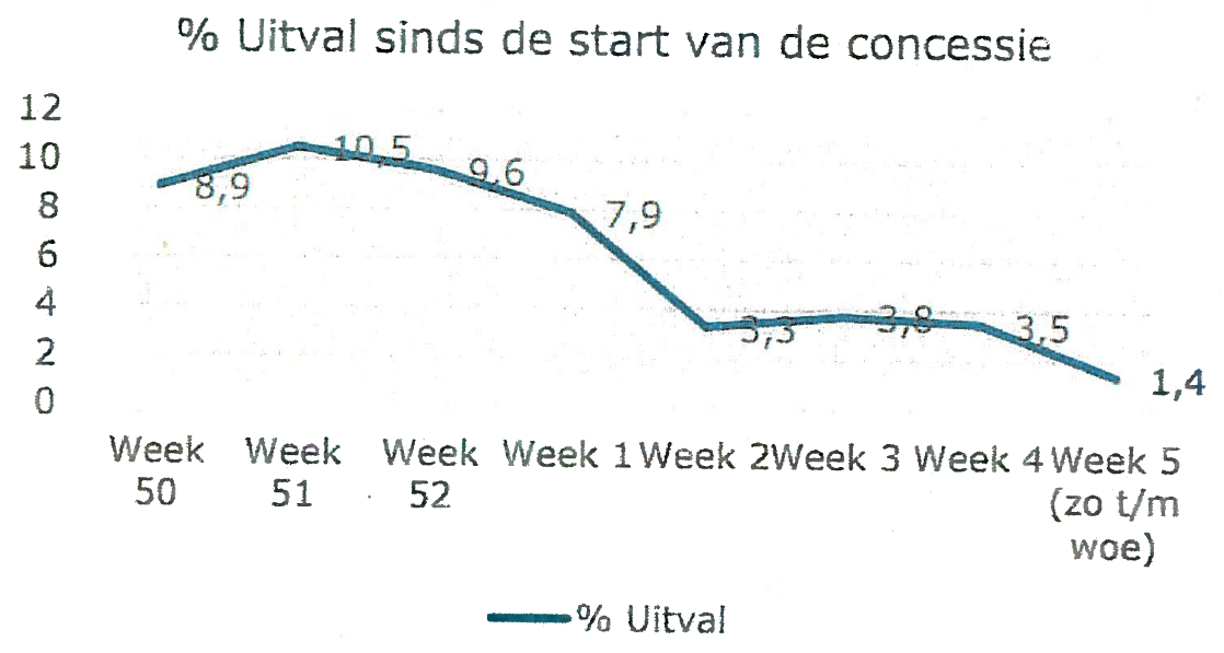 Bij de start van de concessie schommelde de uitval tussen de 8% en 12%. In week 5 laten de uitvalcijfers een positievere ontwikkeling zien. De cijfers in die week schommelen tussen de 1,4% en 3,25%. We zien wel dat de uitvalcijfers op de zondagen hoog blijven liggen, gemiddeld rond de 14%.