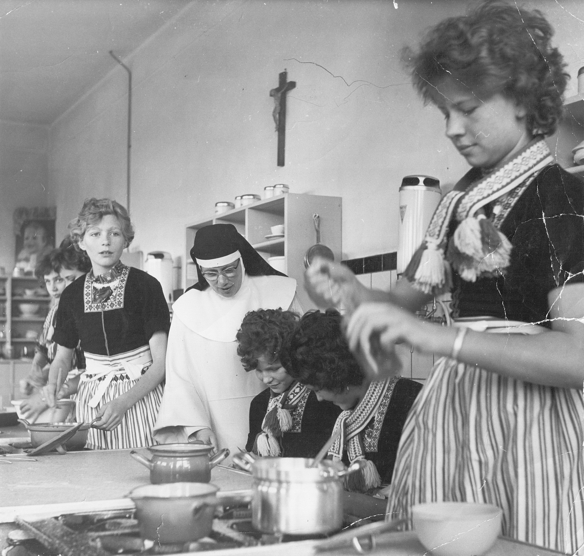 Een groep meiden van de 8e klas krijgt kookles van zuster Augustin. De meisjes moeten hebben geweten, dat ze de volgende dag op de foto zouden gaan, want waarom zouden ze anders tijdens de les een kletje met kralap en een dasje dragen ? Nog ‘link’ ook, want je kon tijdens de les het een en ander op je mooie goed morsen.