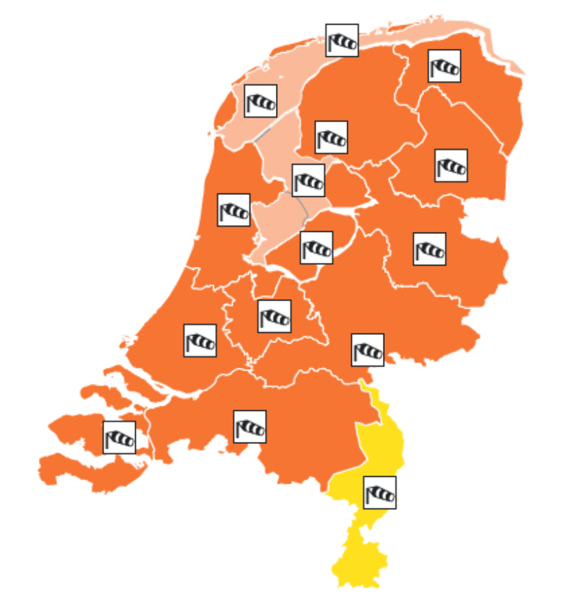 Vanavond kunnen, met uitzondering van de provincie Limburg, zeer zware windstoten optreden. Tevens komen (onweers)buien voor. Langs de kust, boven het IJsselmeer en boven het Waddengebied windstoten van meer dan 120 km/u. Boven land van meer dan 100 km/u. Later vanavond neemt van het westen uit de wind geleidelijk in kracht af.