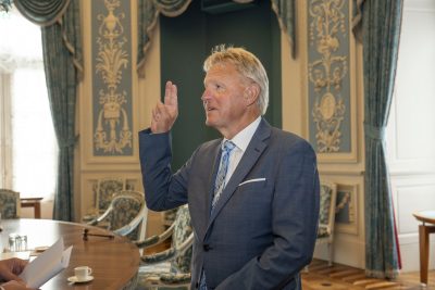 Man in a blue suit taking an oath in an ornate room with blue curtains and patterned walls.Jaap Bond werd vorige week beëdigd door Commissaris van de Koning Arthur van Dijk op het provinciehuis in Haarlem. (foto: provincie Noord-Holland)