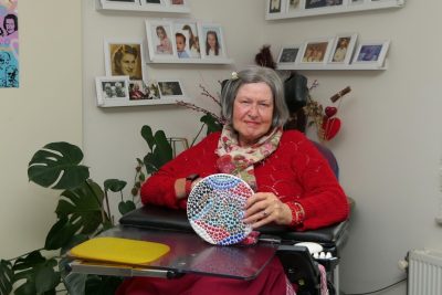 Corry Versteeg is iemand die, ook al kan ze niet meer doen wat ze dertig jaar geleden kon, niet wil opgeven en bij goed weer gaat ze met haar speciale scootmobiel/rolstoel naar de dagbesteding aan de Geulenstraat. ‘Geen punt, het is maar twintig minuten’, zegt ze. Onlangs vierde ze samen met haar kinderen en kleinkinderen haar 70ste verjaardag.