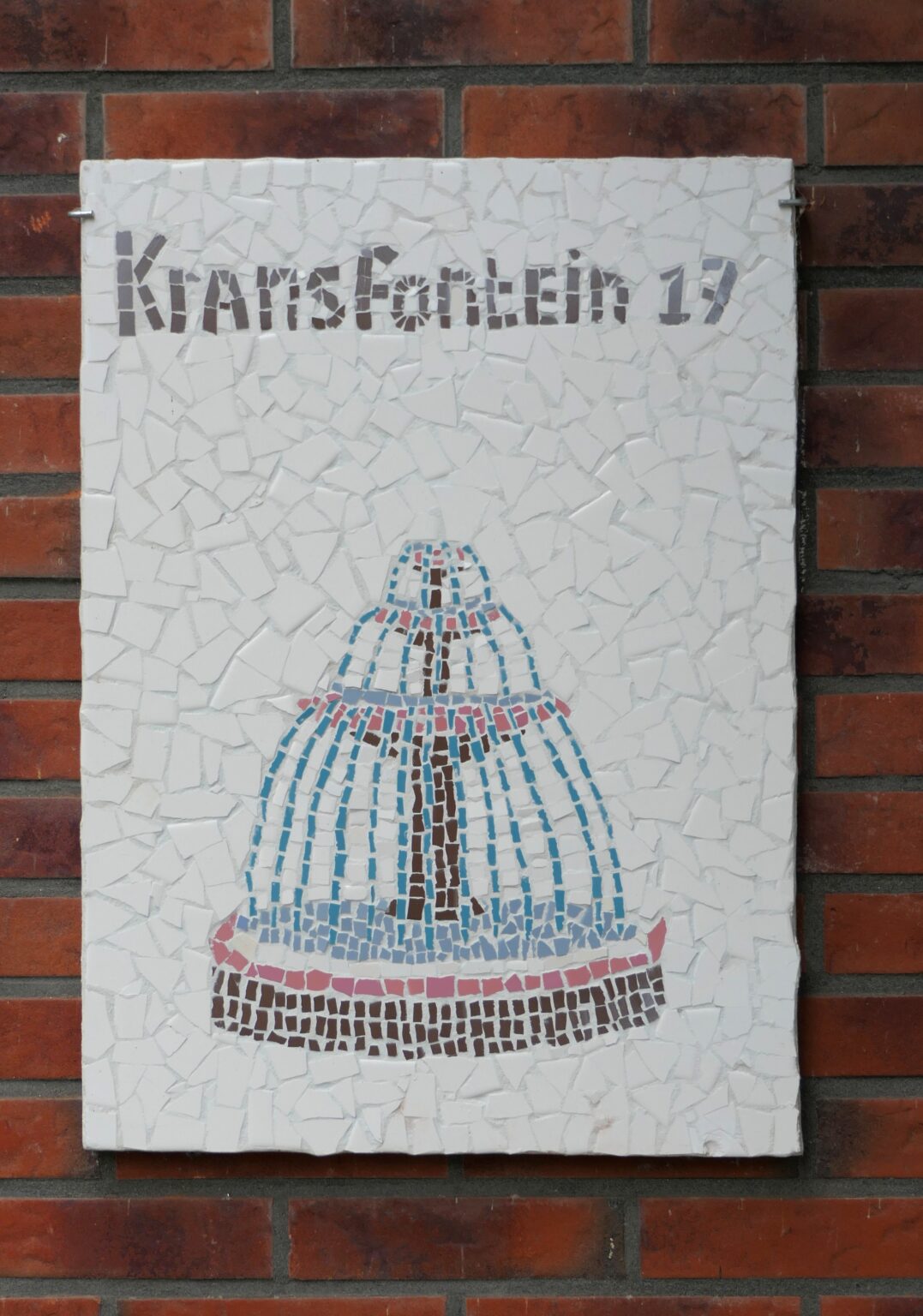 Corry heeft de smaak te pakken en bedenkt dat haar vrienden en vriendinnen bij Odion het misschien leuk vinden om ook een nieuw huisnummer te krijgen en ze gaat enthousiast aan de slag voor de inloopruimte van Odion aan de Kransfontein. Hier kunnen bewoners van appartementen in de buurt langskomen om gezamenlijk te eten of voor een praatje. Het is een prachtig bordje geworden van een spuitende waterfontein. Corry: ”Deze tegel was vrij groot, daar ben ik wel vijf weken mee bezig geweest, maar het was wel erg leuk om te doen en ik ben tevreden met het resultaat.” Op de vraag of ze er rijk mee hoopt te worden, schudt Corry haar hoofd en zegt glimlachend ‘nee hoor, als mensen de materiaalkosten, een paar euro, betalen vind ik het prima’.