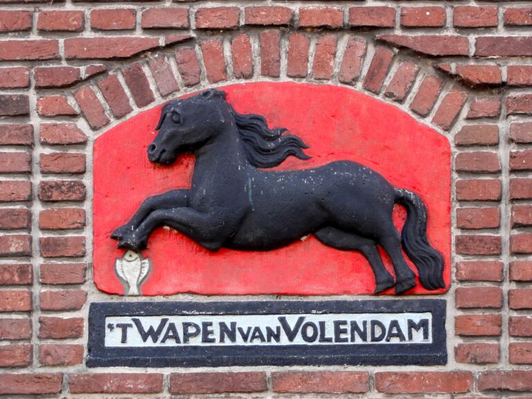 Op dat wapen prijkt een veulen in een weiland, met in zijn voorbeen een bot (platte vis). Het veulen symboliseert de veeteelt en de vis de visserij, die samen de fundamenten van Volendams bestaan vormen. Hoewel men later dacht dat de naam Volendam iets met veulens te maken had, is dat een misverstand. Het dorp dankt zijn naam niet aan een ‘Veulendam’, maar aan een ‘volle dam’: een dichte afsluiting van de oude waterverbinding tussen Edam en de Zuiderzee.