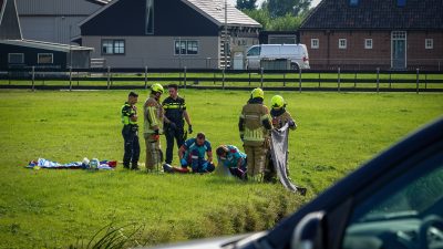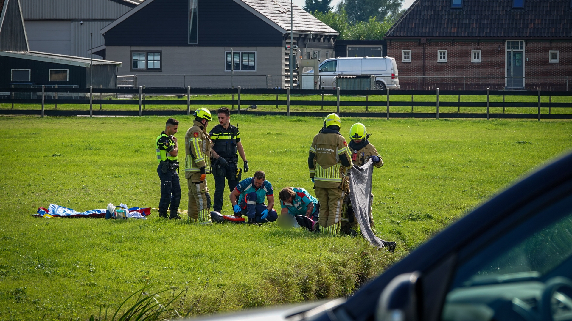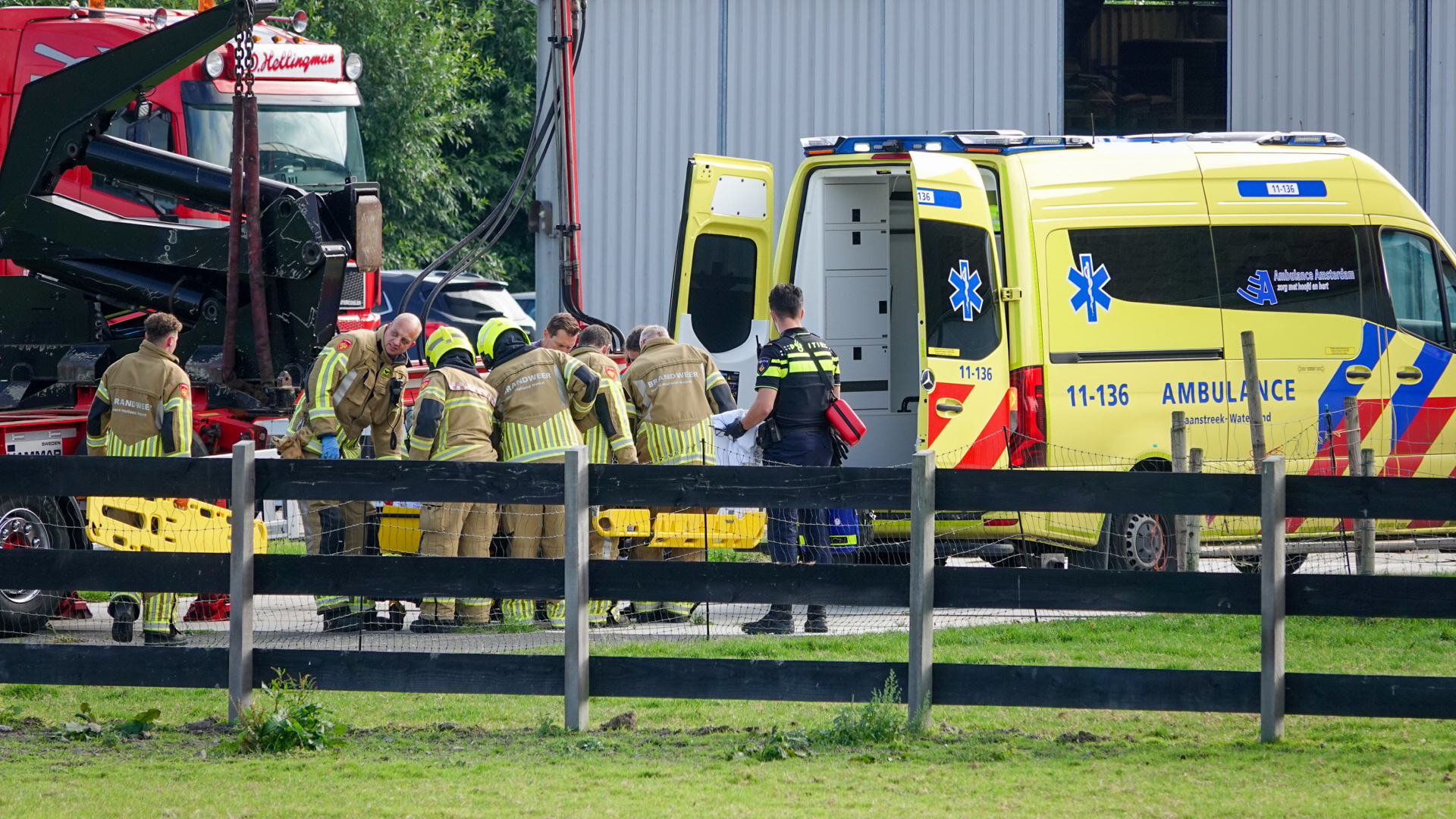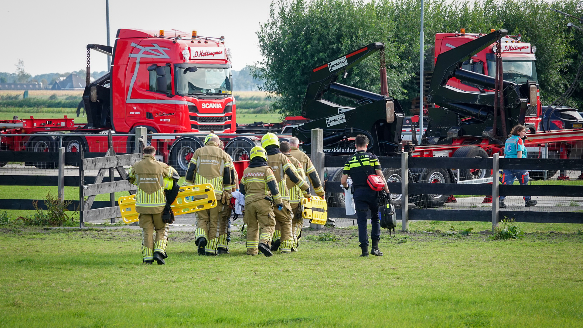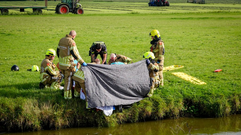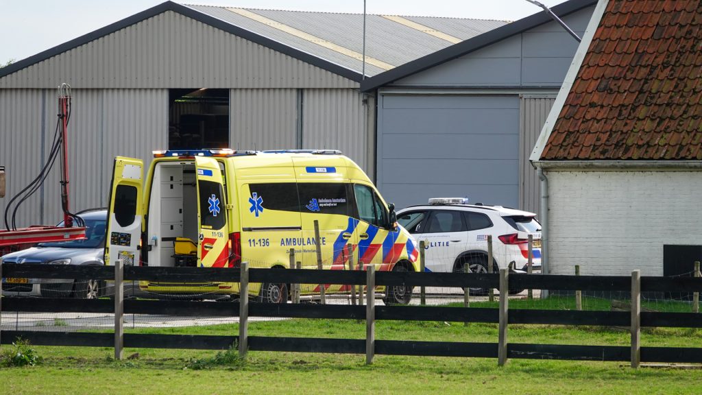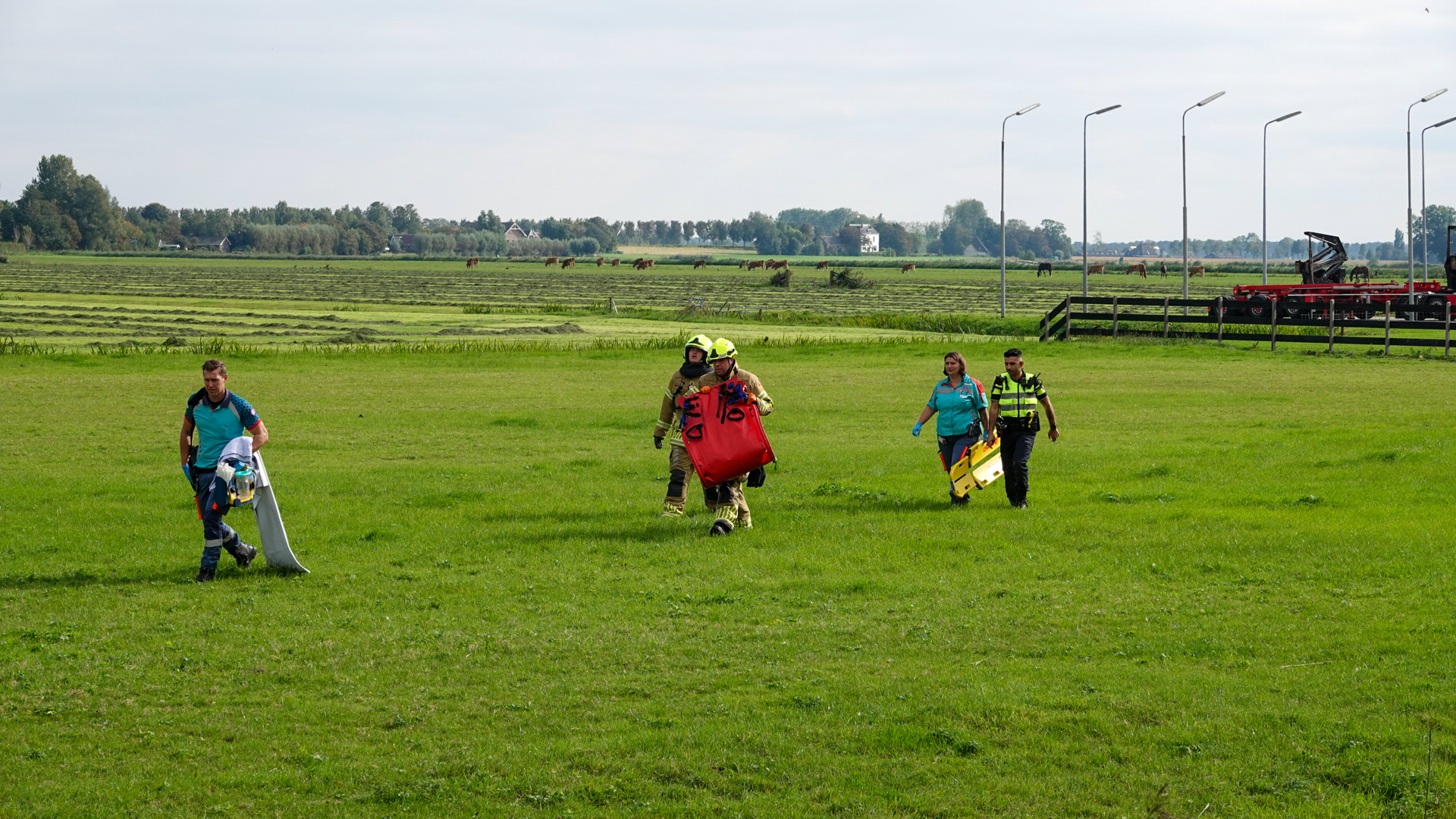 De man is na behandeling ter plekke door brandweerlieden uit het weiland gedragen en vervolgens door een ambulance met spoed naar het ziekenhuis vervoerd.