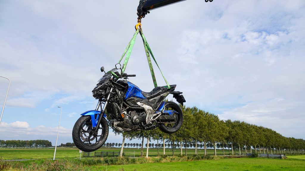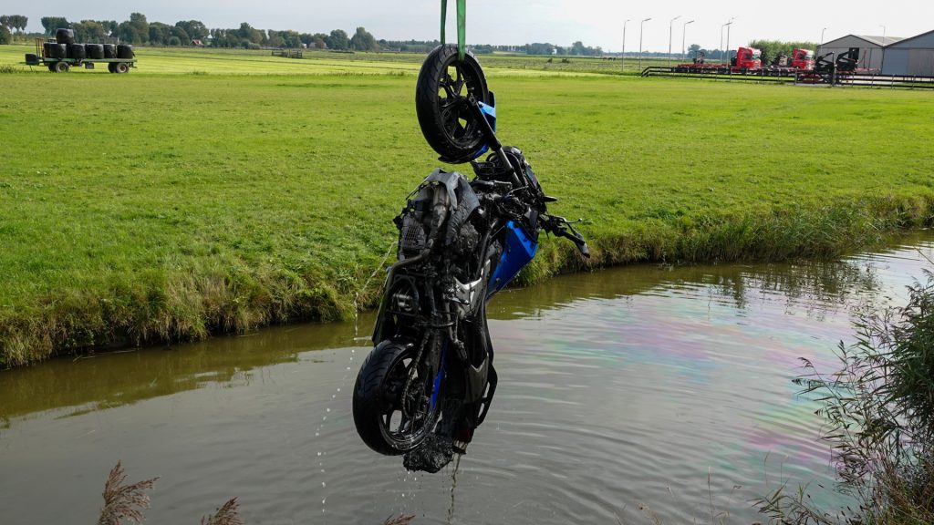 De motor + motorrijder is zo’n 20-30 meter verderop in het water terecht gekomen. De man kon zelfstandig, dan wel met hulp van omstanders op het naastgelegen weiland geraken.