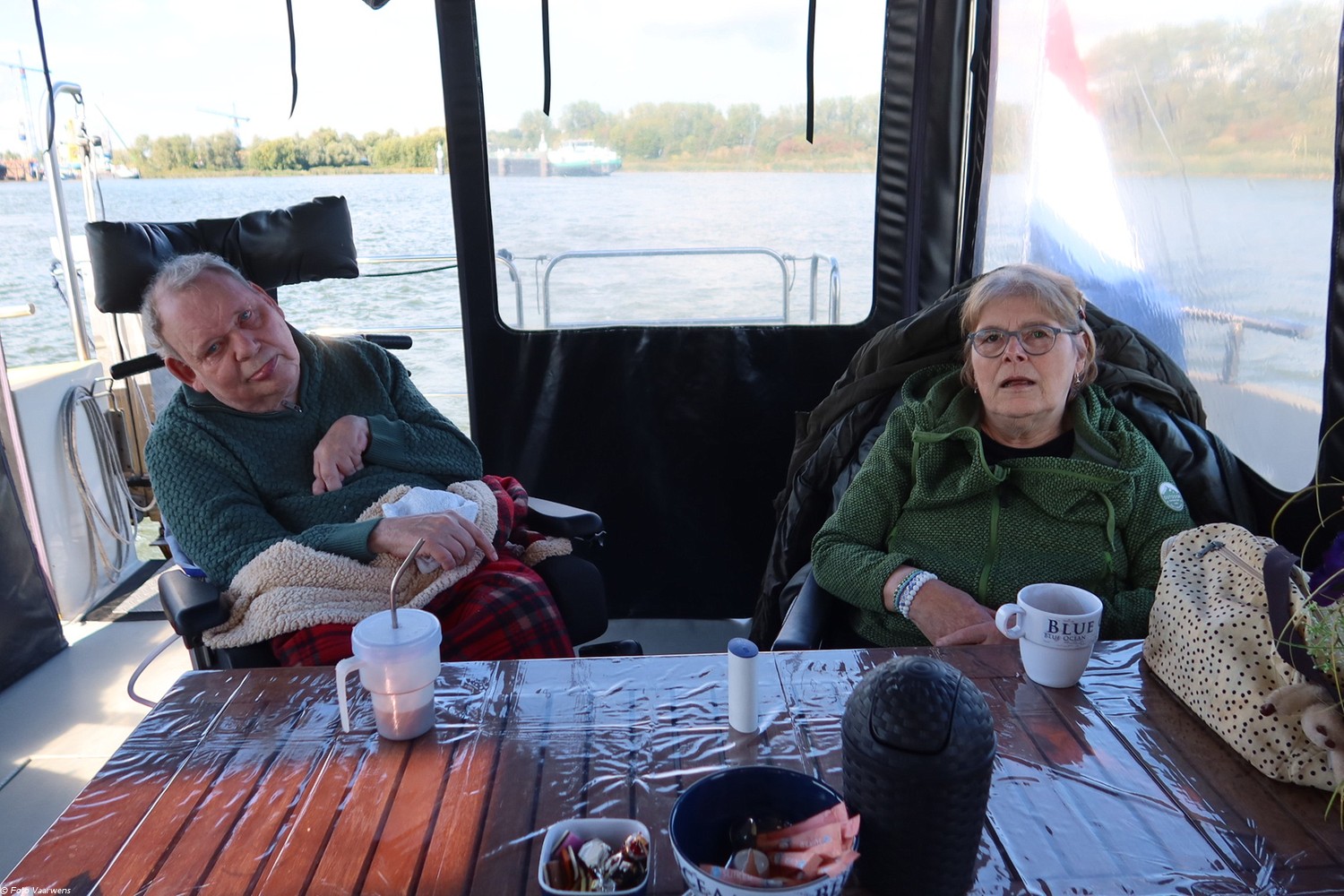Marcel vroeg of Ger op de terugweg wilde sturen, maar zowel de kapiteinspet als het roer overnemen waren geen optie. Ger werd in de rolstoel op de lift gereden en omhooggetild waardoor hij toch over de stuurstand kon kijken. De hele terugreis heeft Ger alleen maar een lach op zijn gezicht gehad en broer Jurgen vertelde ons dat het lang geleden was dat hij Ger had zien lachen. Een mooier compliment konden we niet krijgen.