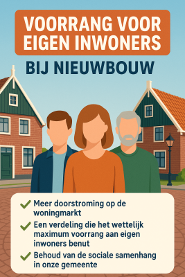 Door een wijziging in de Huisvestingswet mogen gemeenten afdwingen dat maximaal 50% van de sociale huur, middeldure huur en betaalbare koopwoningen (tot €405.000 – prijspeil 2025) in nieuwbouwprojecten met voorrang worden toegewezen aan mensen die een maatschappelijke of economische binding hebben met de gemeente. Dat zijn bijvoorbeeld inwoners die hier al langere tijd wonen of mensen die hier werken.