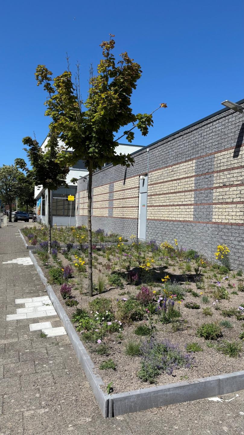 De nieuwe beplanting is aangelegd met speciaal gesteente (lavagranulaat). Dit het helpt verdroging tegengaan en maakt het onderhoud makkelijker. Het geheel staat er over een paar maanden nog kleurrijker en voller bij!