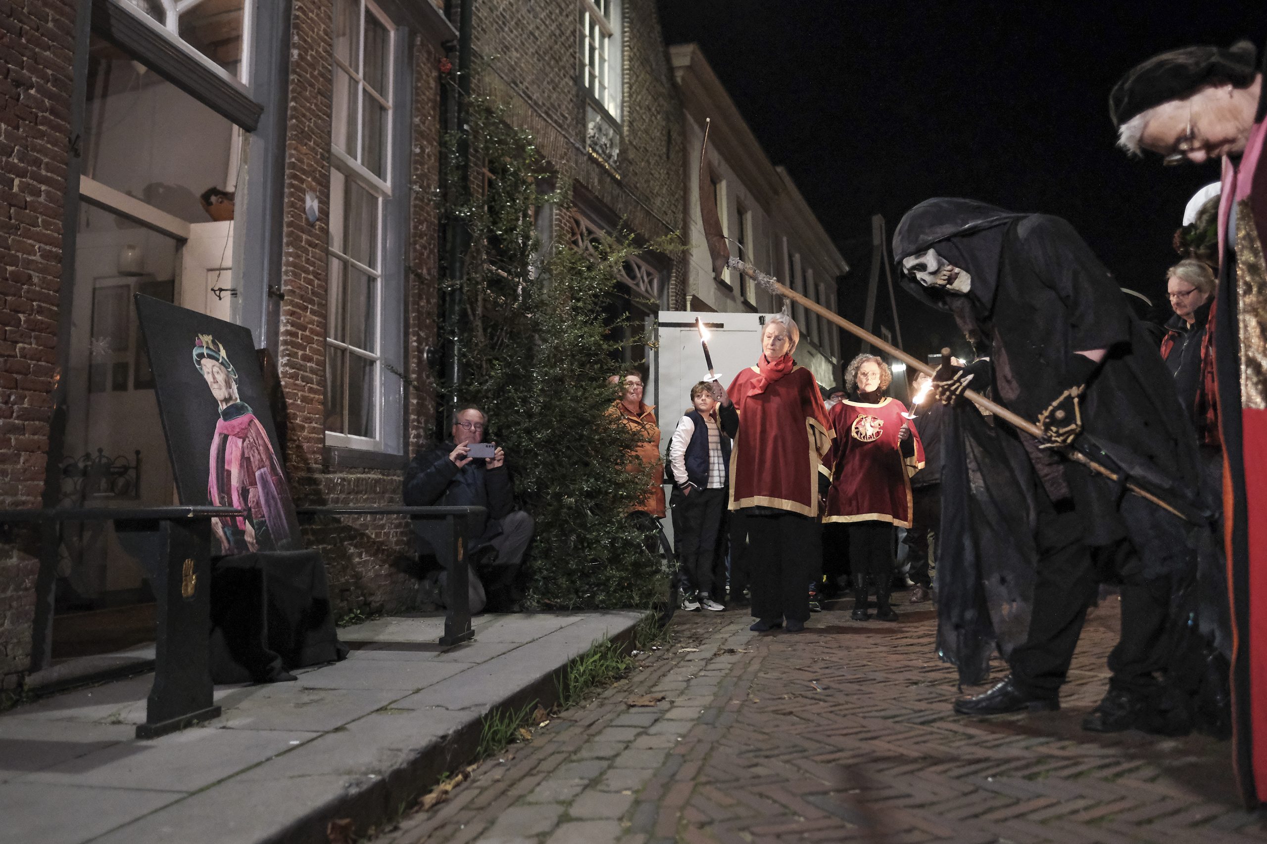 In Monnickendam wordt ‘Allerzielen’ op een unieke wijze verbeeld: in een heuse Dodendans. De dood danst door de stad, gevolgd door een slinger overledenen uit alle standen: een koning, de paus, gravinnen, maar ook eenvoudige sloebers en jonge mensen. Foto’s Bert Strootman.