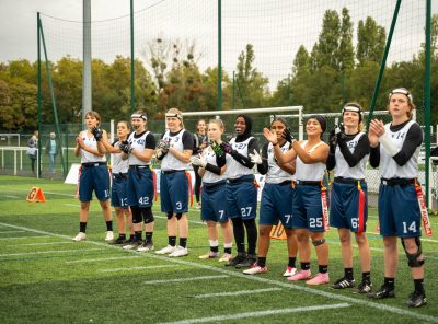 Ze is nog maar ruim een jaar actief maar toch wist ze op te klimmen tot het Nederlands dames team flag football, een nog relatief jonge sport in ons land. Leyla Evrengun uit Edam speelde het EK in Parijs op verschillende posities en beleefde het als een hele mooie ervaring. Ondanks de laatste plaats die behaald werd. Foto: Leyla Evrengun (2e van l.) met het Nederlands dames team in Parijs