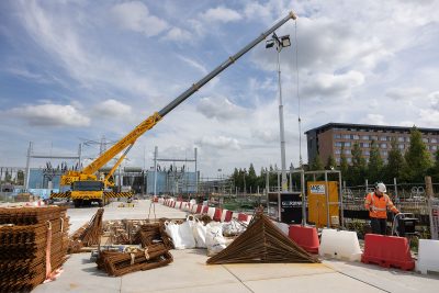 In de bouwkuip zien we damwanden, betonnen muren en vloeren. ‘Eerst hebben we de hoogspanningslijnen van het bestaande station ondergronds gelegd’, zegt Edzo terwijl hij naar één van de grote hoogspanningsmaster wijst. ‘Dat kon niet zonder de masten eerst te verstevigen. Daarna maakten we de grond bouwrijp.’
