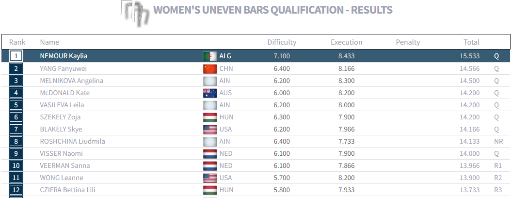 Olympisch brugkampioene Kaylia Nemour uit Algerije kwalificeerde zich als beste op brug: 15,533. Veerman werd door de allerlaatste Chinese turnster die in actie kwam uiteindelijk naar de reservepositie verwezen.