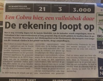 Even terug naar de materiële schade. In samenwerking met de Nieuw Volendam – NIVO deelt de gemeente wekelijks hoeveel ‘de knallen’ de gemeente gaat kosten. Goed voor de bewustwording, goed initiatief!