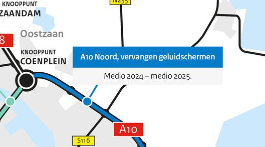 Rijkswaterstaat rondt de vervanging van de geluidschermen A10 Noord af. Vanaf zaterdag 1 november 23.00 tot en met maandag 3 november 05.00 uur is de Ring A10 Noord afgesloten om de laatste werkzaamheden uit te voeren. Vanaf maandag 3 november is het werk afgerond en zijn de verkeersmaatregelen weg.