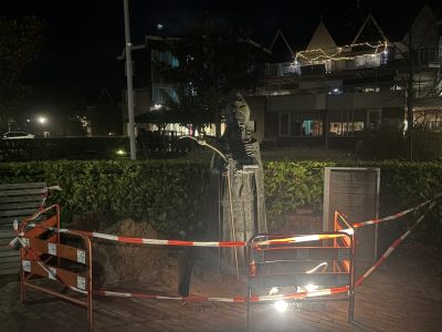 De staf van Sinterklaas staat krom en mist zijn bekende krul: onbekende daders hebben beginoktober het standbeeld van de Goedheiligman bij verpleeghuis Sint-Nicolaashof in Volendam beschadigd.