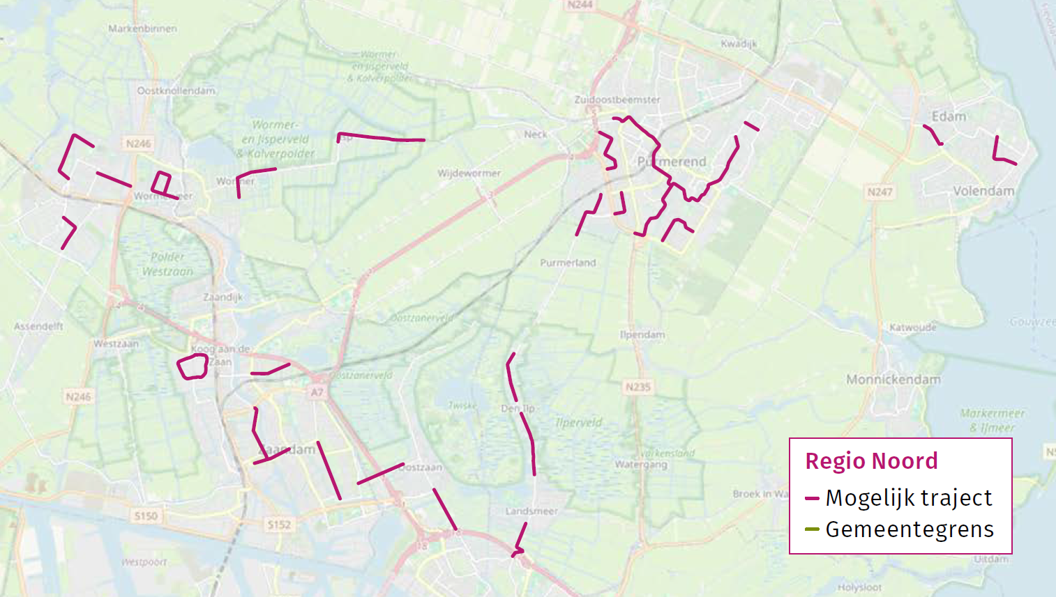 Er zijn al een aantal wegen in beeld in Landsmeer, Oostzaan, Purmerend, Waterland en Wormerland waar de maximumsnelheid mogelijk omlaag gaat, die wegen zijn hieronder te zien. (tekst gaat verder onder de afbeelding)