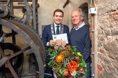 Frans Kuiper was afgelopen 11 november 25 jaar vrijwillige stadsklokkenstelder. Op 11 november 2000 was zijn eerste versteek, en nu 25 jaar later stond op de dag dat we Sint Maarten vieren weer een versteek gepland. Voor het gemeentebestuur een mooi moment om hem in het zonnetje te zetten. Burgemeester Beukers was dinsdag aanwezig om Frans Kuiper te bedanken. Twee keer per jaar gaat de beiaardier (Frits) samen met de stadsklokkenstelder (Frans) de speeltrommel versteken. De beiaardier plaatst dan noten stiften voor de 4 nieuwe kwartier melodieën op de tijdsaanduiding. De stadsklokkenstelder draait aan de binnenkant van de trommel de moeren aan van de notenstiften. En voordat zij samen kunnen versteken verwijdert de stadsklokkenstelder de notenstiften en sorteert noten in 8 maten en dubbele noten. Daarnaast houdt de stadsklokkenstelder gedurende het jaar het uurwerk in de gaten en verricht kleine reparaties en afstellingen aan de tractuur van de mechanieken bij zowel het handspel als aan de speeltrommel.