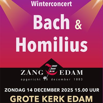 Het einde van het jaar nadert en dus wordt het tijd voor een prachtig winterconcert! Voor dit concert heeft Zang Edam vier mooie composities uitgezocht die worden uitgevoerd op zondagmiddag 14 december 15.00 in de Grote Kerk van Edam. Uit J.S. Bachs Weihnachtsoratorium worden deel IV en V gezongen en van de wat minder bekende componist G.A. Homilius twee feestelijke cantates, die ook in dezelfde rijke kerstmuziektraditie passen: “Frohlocke, Zion , dein Erlöser” en “Wünschet Jerusalem Glück”.