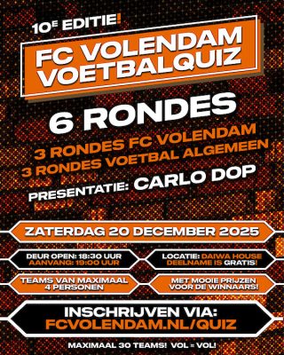 Het is weer tijd voor de grote FC Volendam Voetbalquiz! Dit jaar staat de tiende editie op het programma. Zaterdag 20 december kunnen 30 teams het weer tegen elkaar opnemen, met mooie prijzen voor de winnaars. Er worden in totaal zes rondes gespeeld. Drie daarvan gaan over FC Volendam, drie daarvan gaan over voetbal in het algemeen. De presentatie is in handen van Carlo Dop. Er is plek voor maximaal 30 teams. Een team bestaat uit maximaal vier personen. LET OP: Vol = Vol. De quiz wordt gehouden in de Daiwa House in het Kras Stadion en start om 19:00 uur. De avond duurt tot en met 23:30 uur. Deelname is gratis.