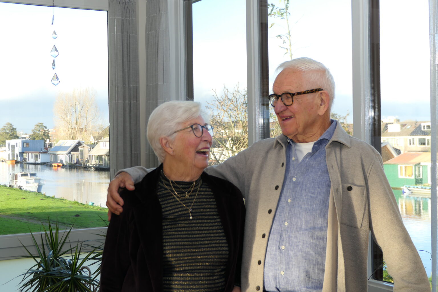 De honden Belka en Strelka, gelanceerd aan boord van de Russische Spoetnik 5, keren in 1960 als eerste dieren levend terug van een ruimtereis. Ook in Nederland, waar een dozijn eieren dan nog maar 55 cent kost, volgt men ademloos de ontwikkelingen in de ruimtevaart. Gerrit Huijgen (nu 88) en Joke Wijnterp (nu 89) blijven liever met de beentjes op de grond en stappen samen in het huwelijksbootje. 65 jaar later komt burgemeester Ellen van Selm op felicitatiebezoek. Cupido richt zijn pijlen op het stel als ze beiden op de Mulo zitten in Apeldoorn. Daarna gaan ze elk een andere richting in, Gerrit volgt een opleiding tot scheepswerktuigkundige en vertrekt daarna naar zee. Joke gaat naar de Kweekschool, later Pabo. De liefde blijft al die tijd toch sterk en uiteindelijk is het verliefd, verloofd, getrouwd. Foto: Piet Jonker – www.weidevenner.nl.