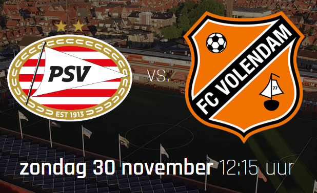 Op zondag 30 november om 12:15 uur trapt PSV af tegen FC Volendam. PSV speelt voor het eerst een thuiswedstrijd sinds de 4-2 overwinning op Fortuna Sittard op 31 oktober.