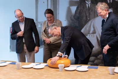 Op woensdag 18 februari bracht de Commissaris van de Koning (CdK) in Noord-Holland, Arthur van Dijk, een formeel ambtsbezoek aan de gemeente Purmerend. Tijdens dit bezoek sprak hij met het college van B&W, de gemeenteraad, maatschappelijke partners en inwoners over actuele ontwikkelingen en opgaven in de gemeente en de regio. Foto: Commissaris van de Koning in Noord-Holland, Arthur van Dijk snijdt de kaas aan bij het bezoek aan CONO Kaasmakers.