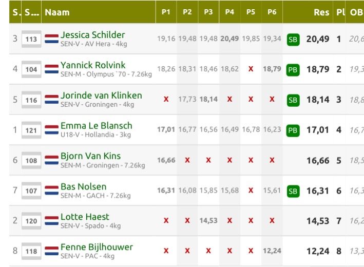 Jessica Schilder heeft vrijdag bij indoorwedstrijden in Omnisport Apeldoorn de beste prestatie van dit jaar geleverd. Bij haar vierde van zes pogingen kwam ze tot een afstand van 20,49 meter.