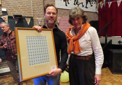 De jarige Stichting Eilandraad Marken werd afgelopen zondag verrast met de terugkeer op Marken van een kunstwerk, welke jaren heeft gehangen in het gemeentehuis van Marken op Kerkbuurt 22 en na de gemeentelijke herindeling, begin 1991, naar Monnickendam werd verhuist. Burgemeester Marian van der Weele had het meegenomen naar het verjaardagsfeestje van de Eilandraad in dorpshuis Het Trefpunt en werd aangeboden aan voorzitter Sander Foppen. Foto: Voorzitter Sander Foppen en burgemeester Marian van der Weele